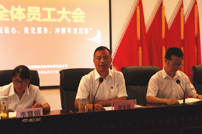 2019年9月30日,公司在五樓報告廳召開“提振信心、優(yōu)化服務(wù)、沖刺年度目標”主題員工大會,全體員工50余人參加會議,公司總經(jīng)理胡海鋒主持會議并做重要講話。
