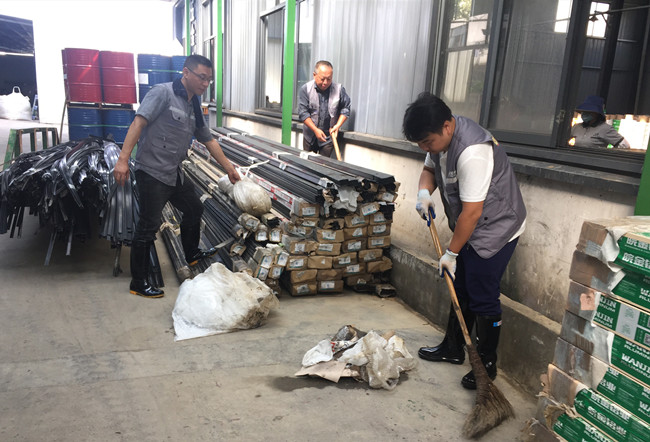 (圖為招商中心、金信財稅員工參加開發(fā)區(qū)金翠谷公司車間打掃。)