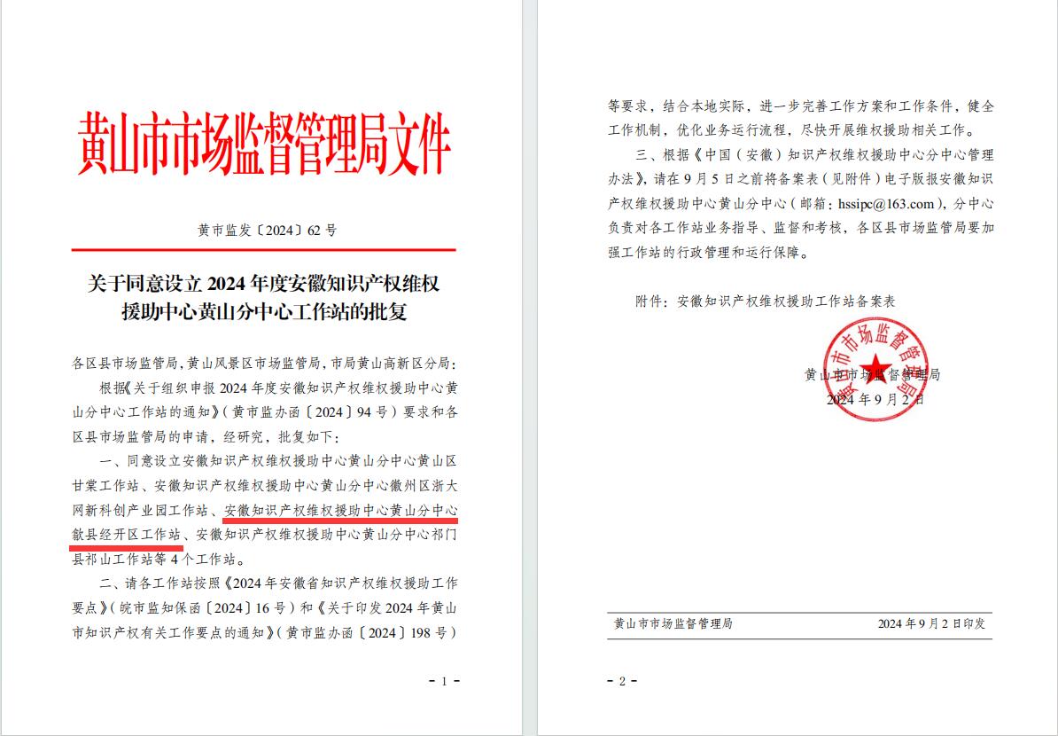 9月2日,黃山市市場(chǎng)監(jiān)督管理局正式批復(fù),批準(zhǔn)安徽香寧眾創(chuàng)科技服務(wù)有限公司成立安徽知識(shí)產(chǎn)權(quán)維權(quán)援助中心黃山分中心歙縣經(jīng)開區(qū)工作站。