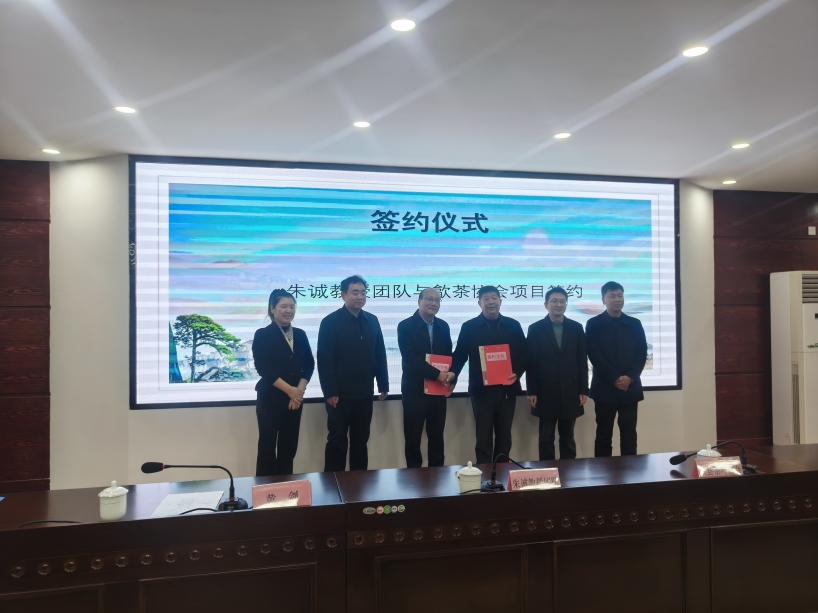歙縣茶葉協(xié)會(huì)與中國(guó)計(jì)量大學(xué)朱誠(chéng)科研團(tuán)隊(duì)達(dá)成合作意向,黃劍等共同見證簽約儀式。
